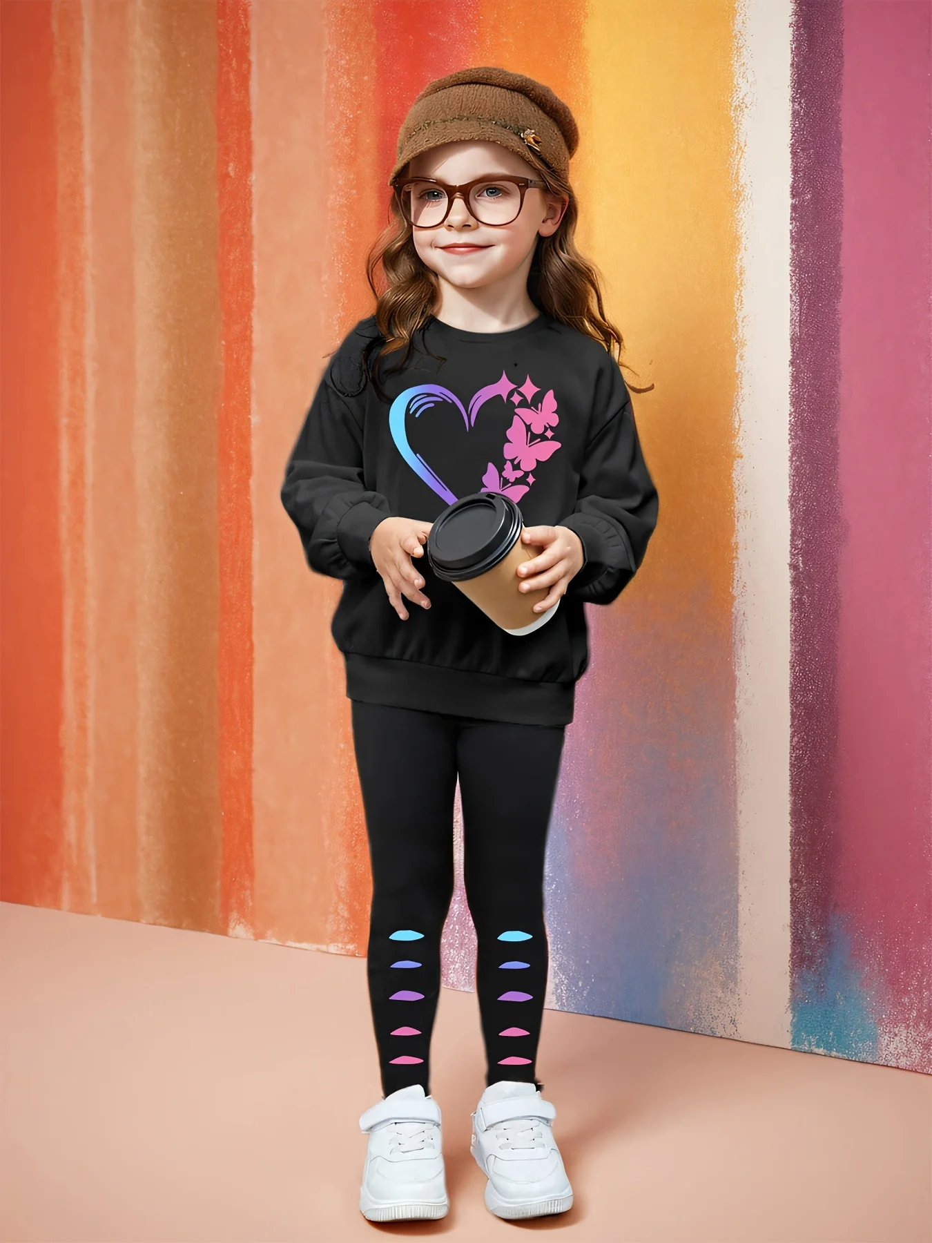 Children's Clothing Girls Autumn Clothing 2-Piece Love Butterfly Print Long-Sleeved Sweatshirt Tights Girl Outdoor Casual Sports Suit